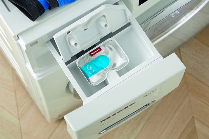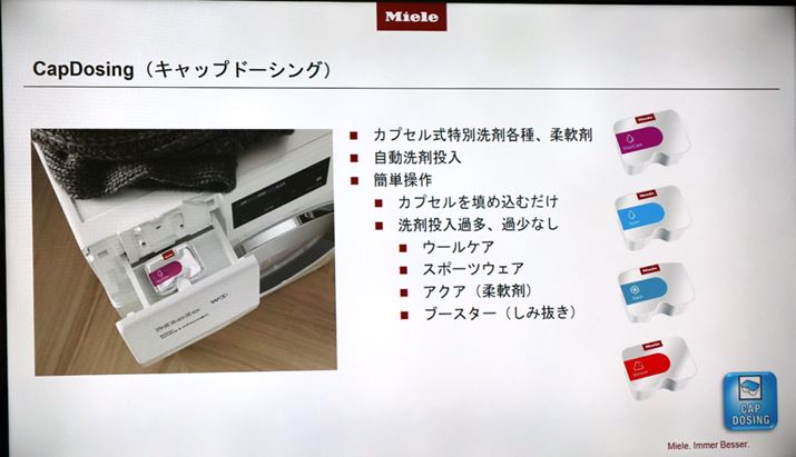 加えて、ミーレ独自のカプセル洗剤投入機能「CapDosing(キャップドーシング)」も搭載しています。洗濯1回ごとの使い切りカプセル洗剤を使用するもので、ウールケア/スポーツウエア/アクア(柔軟剤)/ブースター(しみ抜き)の4種類を用意。カプセルの価格は、各6個入りケースが1,400〜2,000円(税別)となっています。