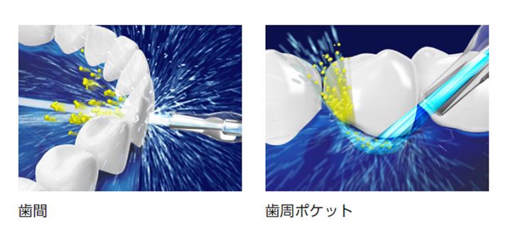 ジェットウォッシャー ドルツの製品サイトには、使い方のコツも掲載。歯間では歯と歯の隙間の三角地帯を狙って水流を当て、歯周ポケットは歯と歯ぐきの境目に沿うようにノズルを動かすのがいいそうです※画像はパナソニックの製品ページより