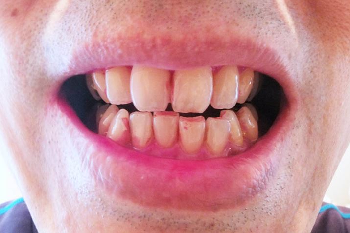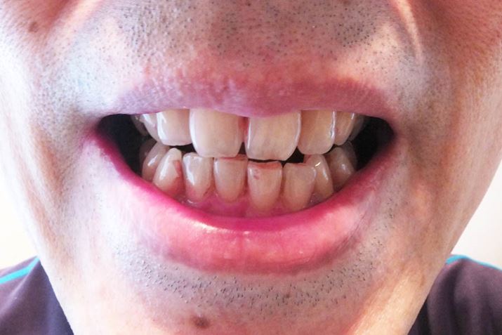 赤く染まった歯垢部分をEW-DJ52で洗浄。真っ白というわけにはいきませんが、上前歯の間など、かなり赤い色が落ちました