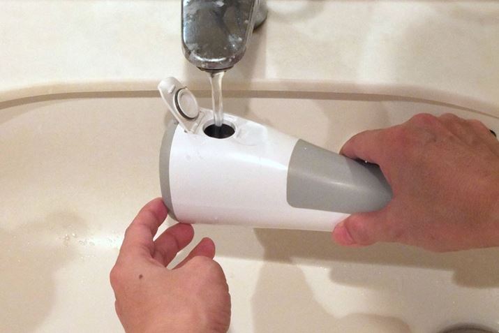 本体を水平にし、給水フタを開けて蛇口から給水。本体は完全防水仕様なので、水がフタからあふれても問題ありません。洗面所や浴室で使うので、洗浄中に水がなくなってもすぐにまた給水でき、筆者はそれほど不便さを感じませんでした
