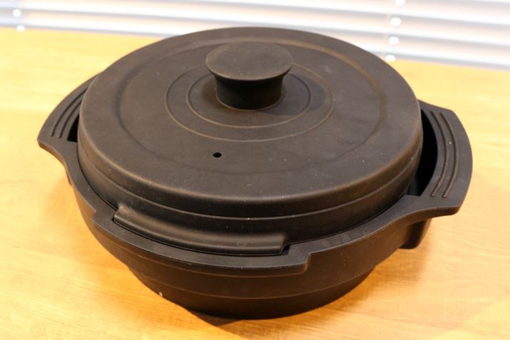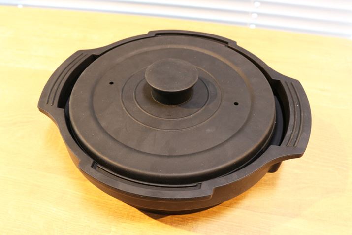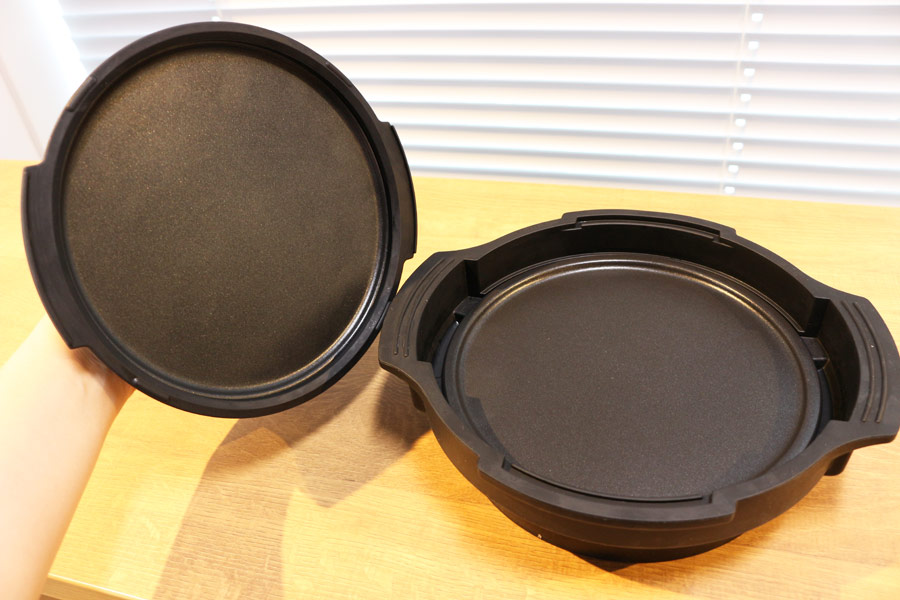 焼き物調理で使用する容器が付属します。シリコン製で、サイズ(本体/フタ)は207(直径)×65(高さ)mm/190(直径)×43(高さ)mm。それほど大きくないので、1〜2人分が作れるといった感じでしょうか