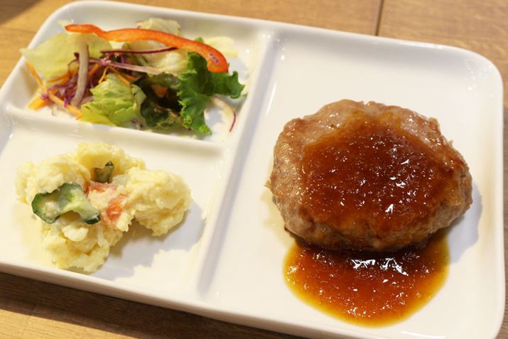 焼き上がったハンバーグを盛り付けてみました。ハンバーグやサラダなど、すべていちから作ったものではありませんが、プレートに並べただけで、手作り感のあるひと皿になりました