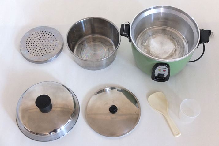 写真上段右から、外釜一体型の本体、内釜、蒸し皿(スチームプレート)、下段右から計量カップ、しゃもじ、内釜ふた、外ふた。内釜ふたは炊き上がったご飯や加熱終了後の煮込み料理を保存するのに使い、基本的に加熱中は使いません
