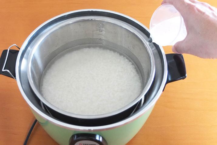 米の量(カップ数)に合わせて内釜の目盛りまで水を入れます。この工程は日本の炊飯器と同じです