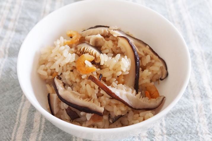 もち米2合を洗ったあと、炒めた豚ばら肉やしいたけ、干しエビなどを入れて炊飯。外釜には白米の倍程度の1と1/4カップの水を入れて、長めに加熱します