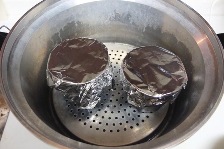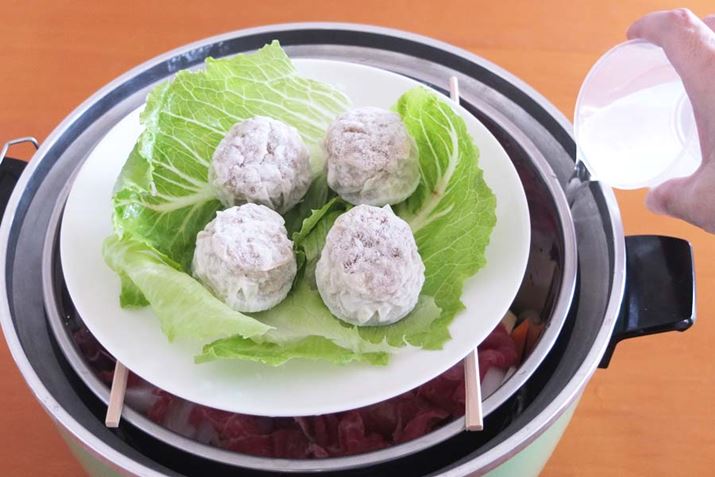 蒸し調理するもっとも簡単な方法は、外釜に水を張って蒸し皿を置き、そこに食材を乗せた皿を置く方法です