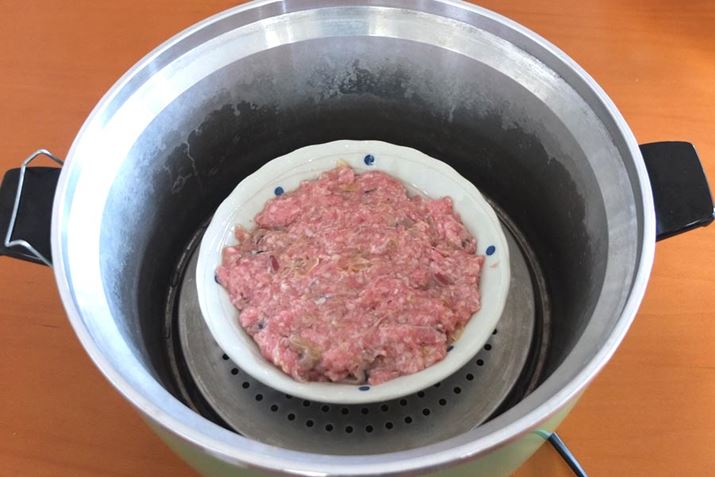 豚ひき肉にひとつまみの塩を入れ、よく練り混ぜてから卵白と塩辛、ネギ、しょうがなどを混ぜ、皿に敷き詰めて蒸し皿にセット。外釜にはカップ1/2の水を入れました。15分程度で加熱終了したので、表面に卵黄を塗り、さらに5分ほど加熱しました