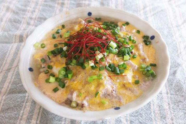 最後に長ネギと糸唐辛子を乗せて完成。卵黄が小さめでひき肉の上全体を黄色で覆うことはできませんでしたが、味はバッチリでした