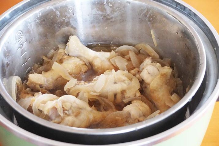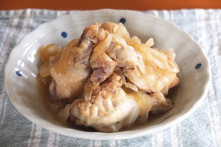 食材は鶏手羽元と玉ねぎだけ。砂糖や醤油、酢などの調味料のみで、水は一切入れていませんが、玉ねぎの水分だけでたっぷりのおつゆができていました