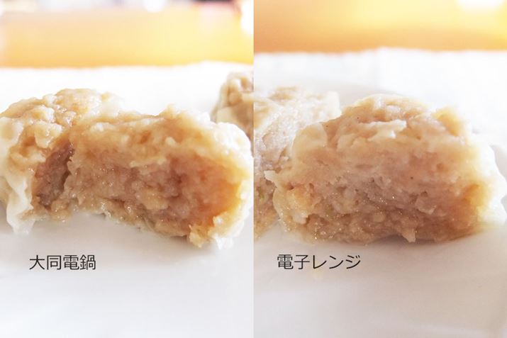 大同電鍋で蒸したのと同じ冷凍焼売を電子レンジで加熱して比較。左が蒸した焼売ですが、皮の表面がみずみずしくツヤツヤしており、中にも肉汁がたっぷり詰まっていました。いっぽう、レンジ加熱した焼売(右)は、表面が乾き気味で、ひき肉ダネもややジューシーさに欠けていました