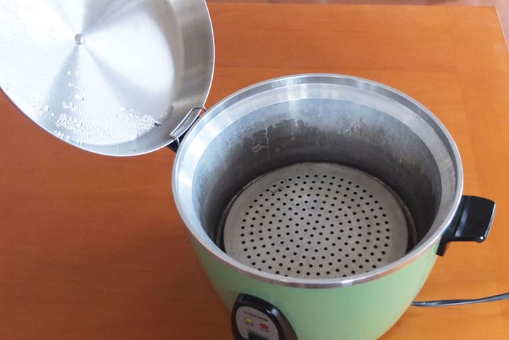 蒸し調理の場合は内釜は使わず、外釜に水を張ってから付属の蒸し皿を敷いて、その上に食材を置いた皿や容器をセットします。加熱時間を水の量で調節するのも同様。水を1度に入れすぎると沸騰したお湯が吹き出すので、6合タイプは付属のカップ1.5杯まで、10合タイプはカップ3杯までにして、長時間加熱する場合は、こまめに水を足して加熱時間を延長するようにします。