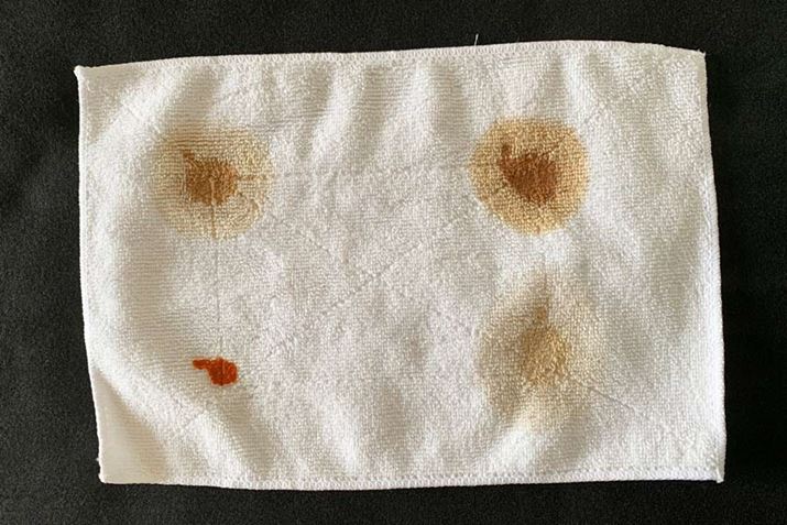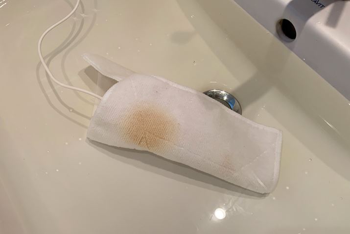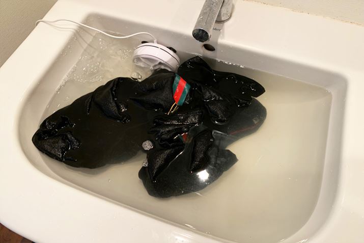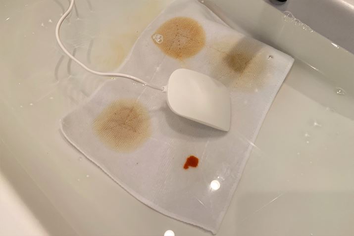 先ほど同様に4種類の汚れが付いた布巾を水の中に浸して、本体を投入します