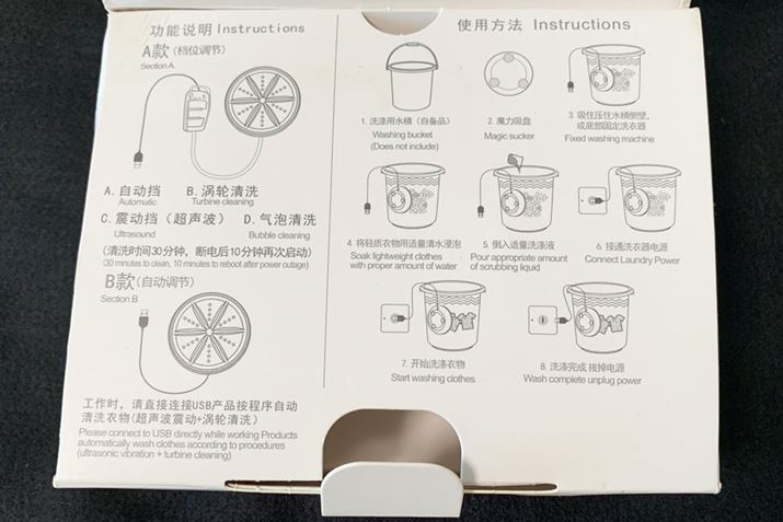続いてもミニ洗濯機やポータブル洗濯機の商品名で各社から似たような商品が販売されているものです。筆者が購入したのは、「RONHAN ミニ洗濯機 小型洗濯機 超音波 USBポータブル洗濯機」なるもの。早い話が、フィンによる水流と超音波による振動のダブル効果で汚れを落とそうというコンセプトの商品です。こちらも、ケーブルを電源につなぐと即スイッチオン。水流と超音波による洗濯を繰り返し(本機ではさらに気泡洗いなるものも加わっています)、30分後に自動停止します。