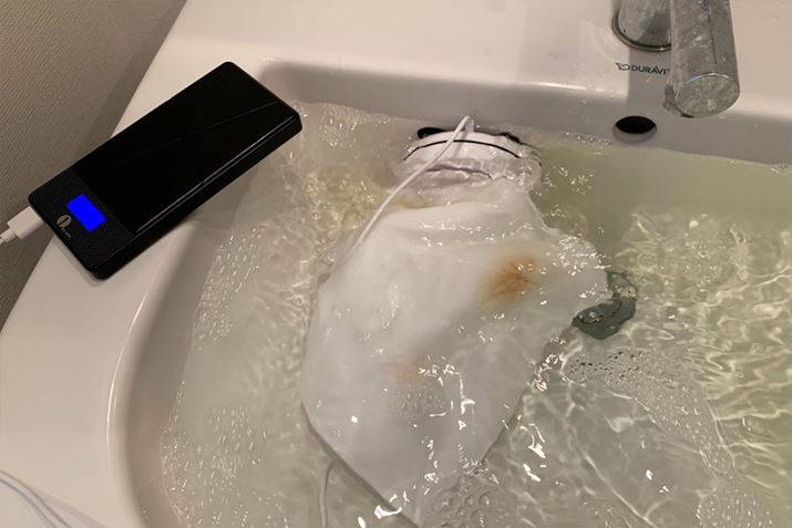 続いては、「超音波洗濯機」などの商品名で販売されているものの中から「ROOMMATE コンビニウォッシャー」なるものを購入して、試してみました。基本的にはつけ置き洗いなのですが、本製品では毎秒12,000回の超音波振動をあたえることで、生地を傷めることなく洗濯ができるとあります。仕組み的にはメガネ屋さんの店頭に置いてある洗浄機のような原理かと思われます。使い方は簡単で、本体を洗濯物と一緒に水の中につけるだけ。
