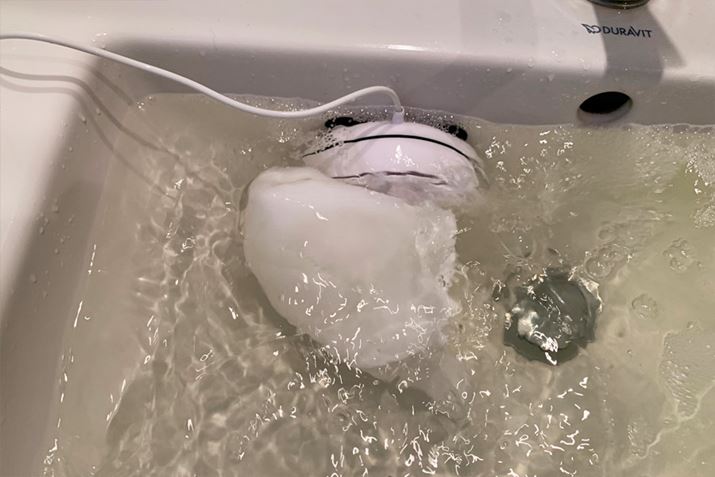 ケーブルを接続するとすぐに動き始め、水流が発生します。撮影の都合で近くにバッテリーを置いていますが、実際に使うときは水がかからないよう離れた場所や高いところに置くなどしてください
