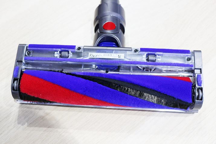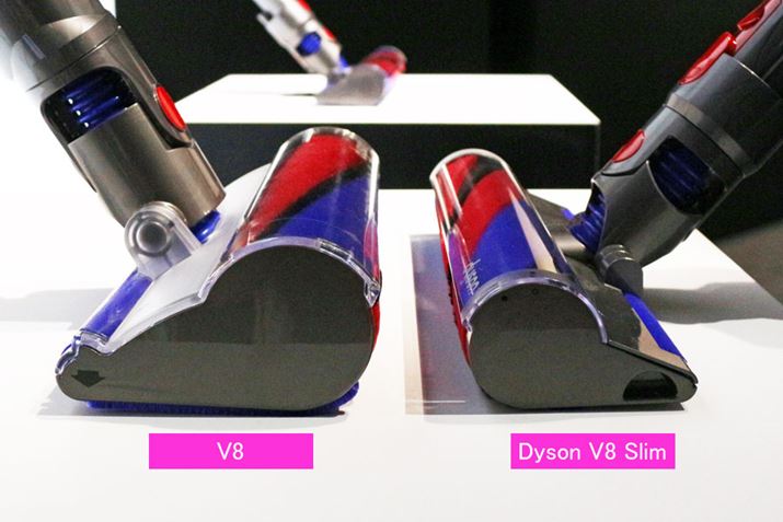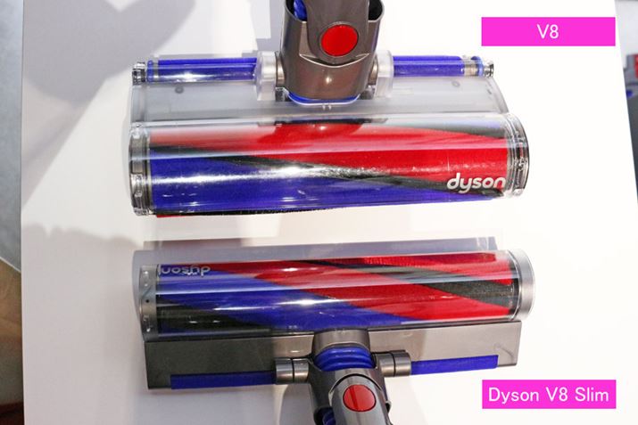 そして、ソフトローラークリーナーヘッドをコンパクト化し、「スリムソフトローラークリーナー」となったヘッドも大きな要素です。回転ブラシの直径を29%小さくし、それに合わせてブラシ内に搭載する自走用のモーターや部品を小型・軽量化することで、ヘッドのサイズと重量はV8よりもそれぞれ40%ダウン。ヘッドの幅はそのままに、高さと奥行を抑え、狭い場所を掃除しやすくなりました。