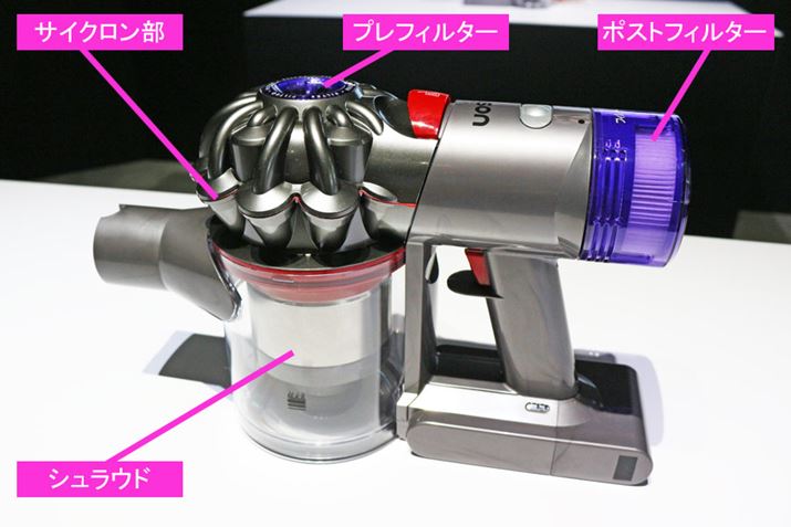 小さく、軽くなっても、V8のデジタルモーターやダイソンならではのサイクロンシステムを搭載しているので、吸引力の持続性と集じん力はバツグンです。掃除機に吸い込まれたゴミは、クリアビン内にあるシュラウドで濾され、次に2層に配置された15個のサイクロンでゴミと空気を遠心分離。その後、プレフィルター→ポストフィルターという流れで0.3ミクロンの微細な粒子を99.97%捕らえる流れとなっており、部屋の空気よりも排気がキレイなのも特徴です。
