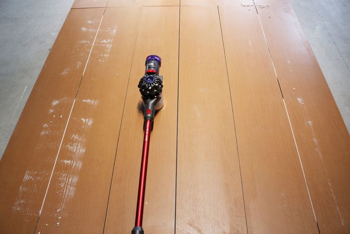 他メーカー製品は、ゴミをヘッドで押してしまったり、取りこぼしがたくさんありますが、Dyson V8 Slimで掃除機がけした部分は溝までキレイ!
