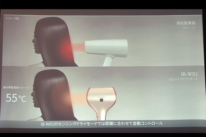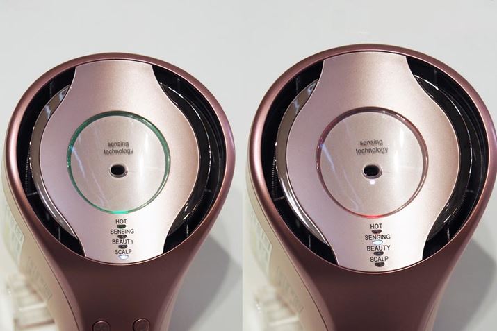 ドライヤーとしては初めて距離センサーを搭載したのも本製品の特徴です。センサーを活用するのは、センシングドライモードでの運転時。センシングドライモード時はつねに送風口と髪との距離をチェックし、髪が遠い時は温度を高くして乾燥性能をアップ。反対に髪が近づくと送風温度を下げて髪が高温にならないようにケアします。髪は55℃以上になるとケラチン(タンパク質の1種)がダメージを受けると言われていますが、センシングモード時はつねに55℃以下に温度を保ち高熱による髪ダメージを抑制可能です。