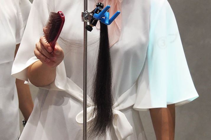 下は、会場で行われた人工頭髪による静電気抑制のデモンストレーションの動画。プラズマクラスターを吹き付けながらブラッシングをすると、ブラシ後も髪の毛が静電気で広がることがありませんでした。