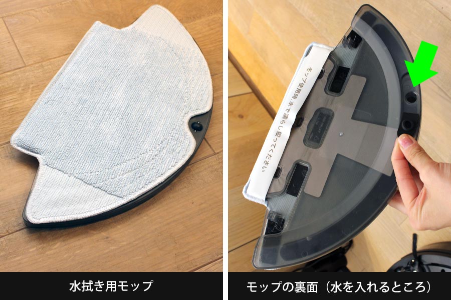 水拭き掃除を行うために必要な、水タンク一体型の専用モップ。裏側に最大60mlの水を入れて使います(緑の矢印部分から給水)。タンク容量が大きくはないので、1度にそこまで広いエリアを水拭きできるというわけではなさそう