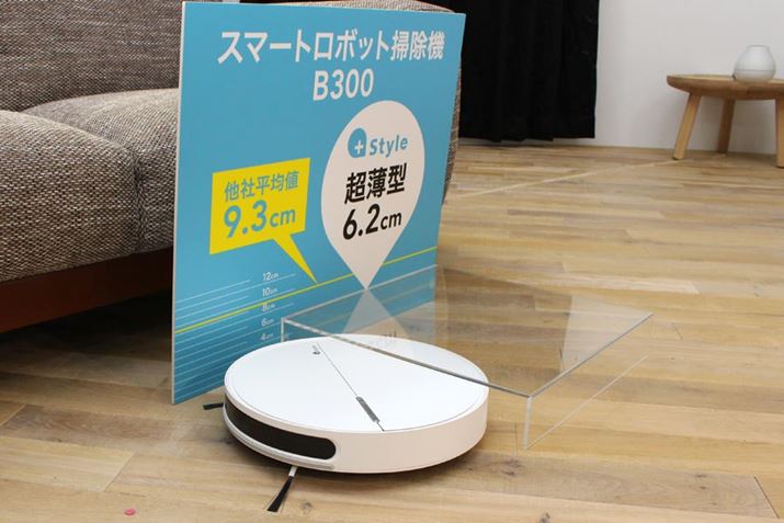 続いて、もうひとつの新しいロボット掃除機B300は、本体の厚みがわずか6.2cmというエントリーモデルです。メーカー希望小売価格は19,800円(税込)と、ロボット掃除機としてはかなり低価格ですが、簡易的なルームマッピング機能にも対応しています。