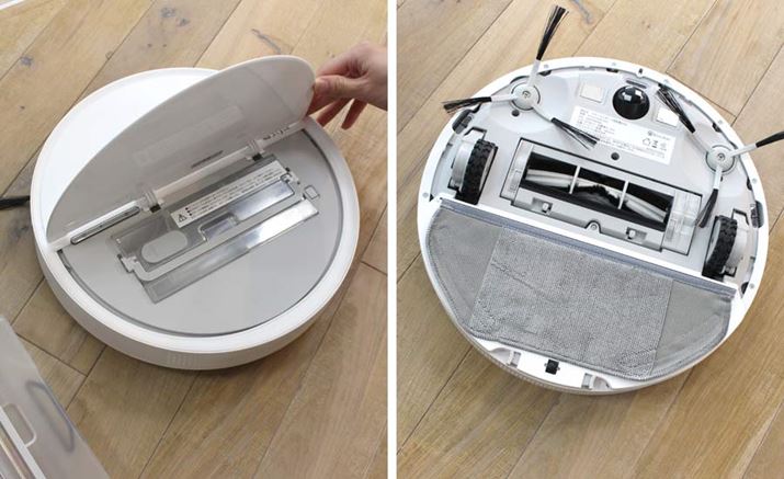 水拭きする場合は、専用モップをセット→内蔵のダストボックスを取り外し、代わりに水タンクをセットして使います(ダストボックスと水タンクを入れ替えて使うので、掃き掃除と水拭き掃除の同時使用は不可能)。