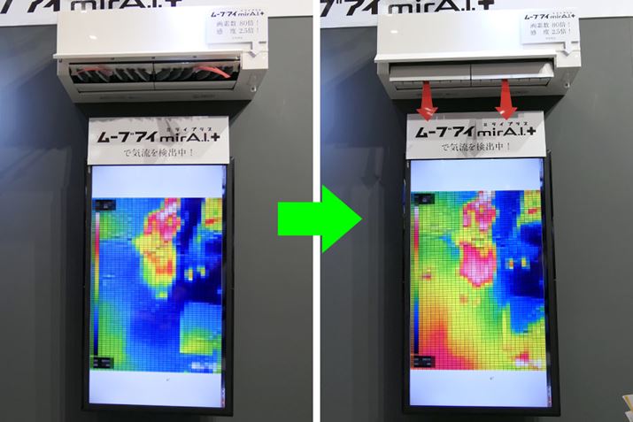 新しい「霧ヶ峰」は、人が寒いと感じている場合、気流の到達点を把握。さらに、人の表面温度から温冷感をみて「人はまだ寒い!」と判断します。すると、人があたたかいと感じられる位置に向けて気流と風向を調整します。その調整は「リモコンで操作できないほど細かく行う」のだそうです。