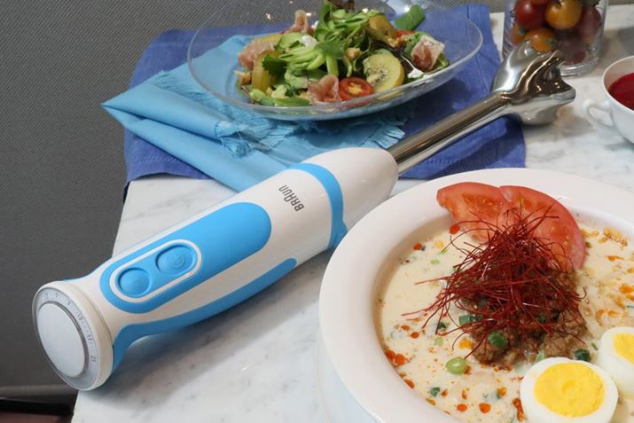 白と青のツートンカラーがかわいい「ブラウン マルチクイック 5 ヴァリオ フィット ハンドブレンダー」。おそらくオッサンが持ってもかわいい