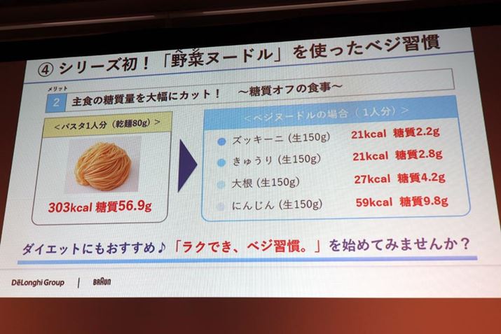 なお、試食はありませんでしたが、イベント会場にはニンジンをパスタに見立てた「ベーコンとキノコの味噌クリームベジパスタ」と、ズッキーニを使った「サーモンとトマトのズードルパスタ」も展示されていました。それぞれニンジン1本、ズッキーニ1本で1人分となり、パスタを使うよりもカロリー抑えめでしっかりと食べられるメニューです。