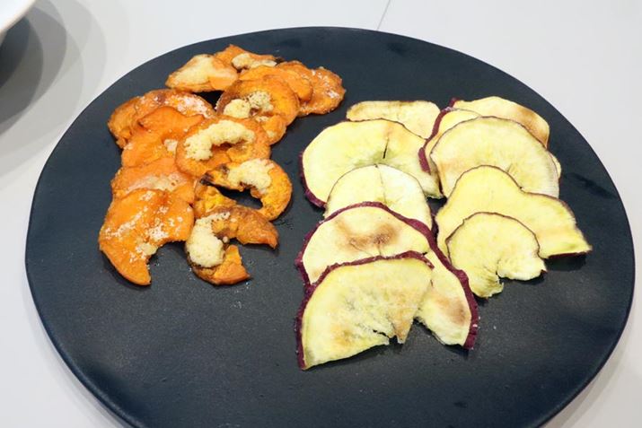 次に、太めのスパイラライザーを使った「皮ごとヘルシーチップ」です。スライスしたサツマイモやニンジンに下味をつけてレンジでチンするだけ。油で揚げていないのでヘルシーです。若干硬めではありますが、下味がしっかりついていておいしいし、野菜をがっつり食べている感じがして腹持ちもよさそう。