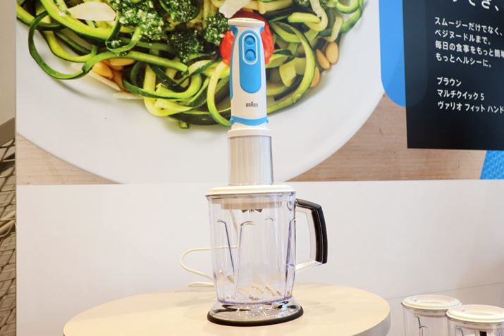 MQ5 ヴァリオ フィットは、「MQ5064」と「MQ5035」の2機種をラインアップしています。それぞれブレンダー本体は共通で、チョパーなどの付属物が異なるのですが、今回は特徴的なMQ5064に注目しましょう。というのも、同モデルには野菜(ベジ)ヌードルが作れる「スパイラライザー」が付属しているのです。ブレンダーでベジヌードルが作れるモデルは、国内では本機が初めてではないでしょうか。