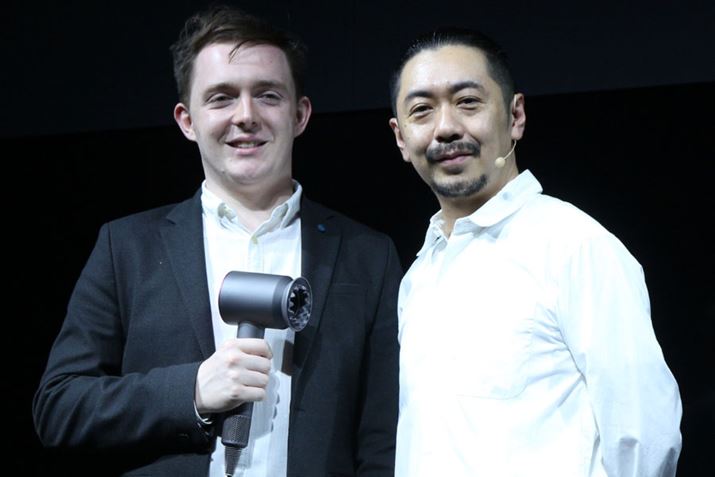 プレゼンテーションに登壇したダイソン パーソナルケア部門 製品開発 アドバンスドデザインエンジニアのサム・バロース氏(左)と、製品を使用したデモンストレーションを行ったヘアスタイリストの渋谷謙太郎氏(右)