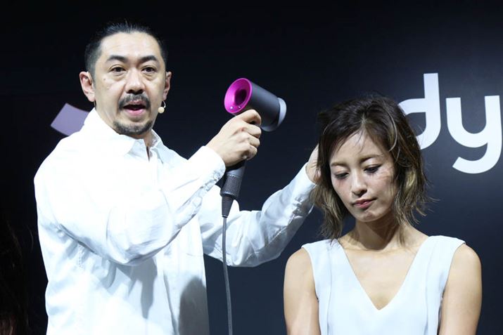 発表会では、大のダイソンファンで、自身が経営するヘアサロンでも、全席に「Dyson Supersonic」を設置しているという、ヘアスタイリストの渋谷謙太郎氏によるデモンストレーションが行われました。「ジェントルエアーリング」については、装着することで髪や頭皮が過度に熱くなる心配がなくなるので、ドライヤー小刻みに振る必要がないと、その使いやすさを絶賛しました。