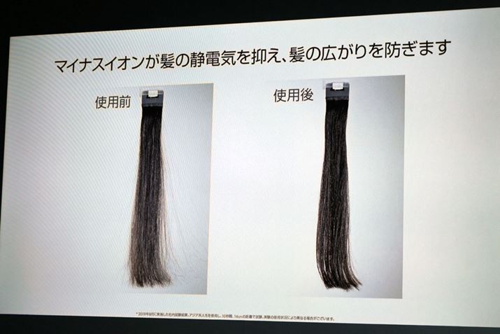 今回の発表会では、「Dyson Supersonic Ionic」の風には、4,100万個/1cm3ものマイナスイオンが含まれていることも公表されました。実はこれは従来機「Dyson Supersonic」と同様の仕様で、これまでは積極的にうたわれることがありませんでしたが、今回改めてアピール。製品名にも「Ionic」を付けることで、マイナスイオン効果を強調したそうです。