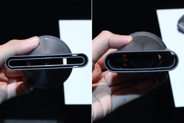 「ジェントルエアーリング」の装着の有無で風の形がどのように変化するのかを可視化したデモンストレーション。装着なしの場合は、空気が1点に集中するように当たっているのに対し、装着している場合は、幅広い範囲に同じくらいの圧力で風が届いているのがわかります