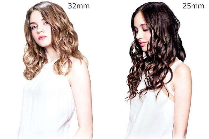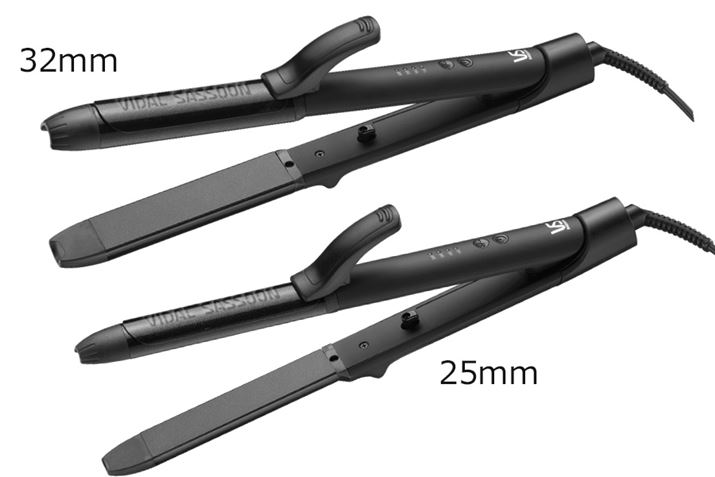 「VSI-3250/KJ(32mm)」は、太めのパイプでふんわりナチュラルなカールが得意(左)。パイプが細めの「VSI-2550/KJ(25mm)」は、くっきりゴージャスなカールや、短い髪のアレンジに向いています(右)