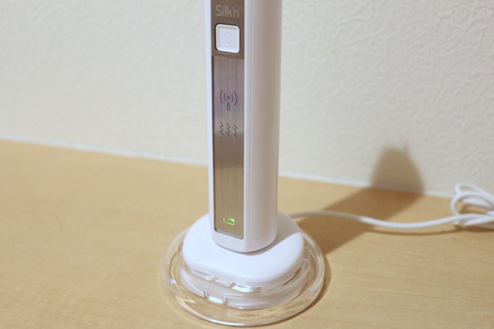 充電は、専用アダプターに置いておくだけ。1回の充電(初回は24時間)で、約2週間使用できるそう(1日2回使用した場合)