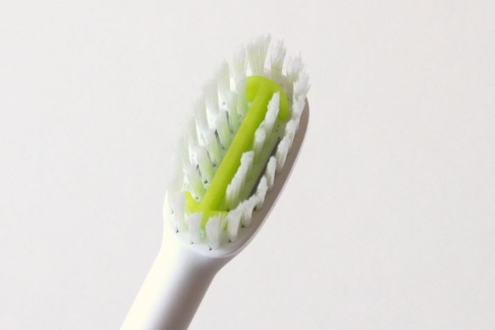 歯ブラシの中央を縦断するようにある黄緑色のシリコン(特許出願中)。ブラシヘッドの毛先がつねに歯にしっかり接触しているように使用することが推奨されています