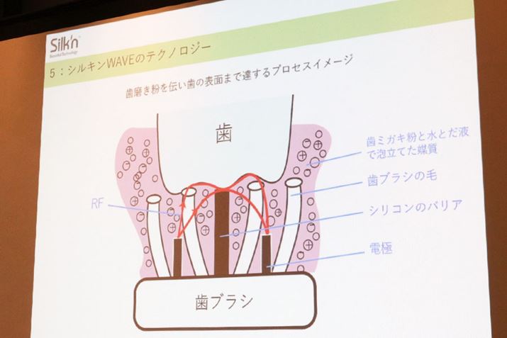 RFというと、エステサロンでの痩身トリートメント機器などに採用されているイメージがありますが、シルキン ウェイブの仕組みは、まず、荷電粒子のRFが歯の表面を包み込むことで、不純物をつないでいる強力な結合を不安定化させ、不純物を歯の表面からはがします。RFのエネルギーと歯磨き粉の相乗効果によって、フッ素化合物などの無害な粒子が不純物がはがれた隙間に入り込み、歯を美しくするというもの。入り込んだ新しい粒子は、歯の表面を不純物から守る働きも期待できるそう。不純物が再び歯に付着するのを防ぐことで、清潔で美しい状態をキープするとのこと。