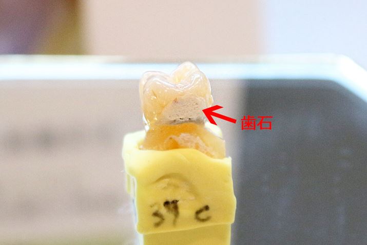 シルキン ウェイブを1年間使用した歯。手前に白く見えるものが歯石で、使用前は歯の上にも同様の歯石がついていたそうですが、シルキン ウェイブをでケアを続けたことで、写真のようにつやのある歯になったそうです