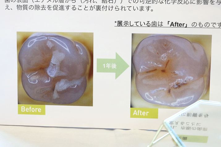 発表会場には、シルキン ウェイブを1年間毎日使用し続けたのと同等のケアを施した歯が展示されていました。虫歯によって抜歯したものを使用しており、もともとは大きな歯石が付着していたとのことですが、展示されていた歯はツヤのある白い歯でした。