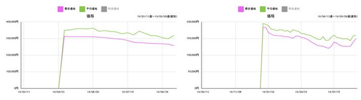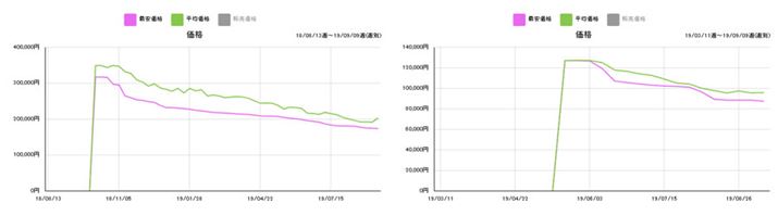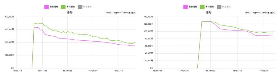 大型テレビ2モデルの価格推移。左のソニー「BRAVIA KJ-55A9G」は6月発売で、まだ発売から3か月程度であるため、最安価格もまだ下がりきっていない。これに対して、1月発売のパナソニック「VIERA TH-49GX850」はすでに半年以降が経過しているため、最安価格もかなり下げて底値に近い状況だが、すでに在庫薄で価格は上昇気味だ