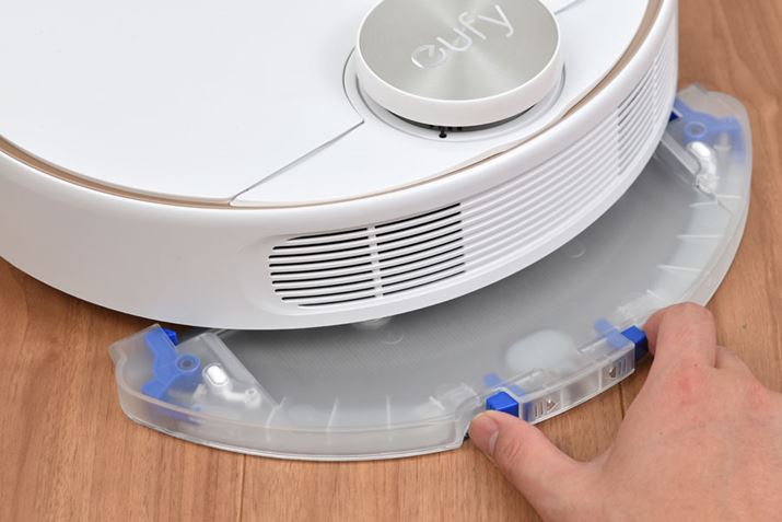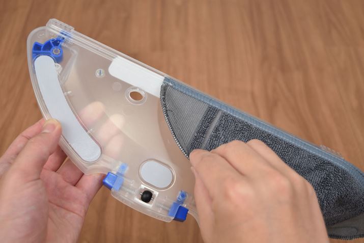 実際に「L70 Hybrid」を走らせてみよう。今回は吸引掃除と同時に水拭き掃除を行うため、水タンクに水を入れ、水拭きに使用する「モッピングクロス」を水で濡らし、水拭き用アタッチメント「モッピングモジュール」に取り付けて本体底面の後方にセットする。