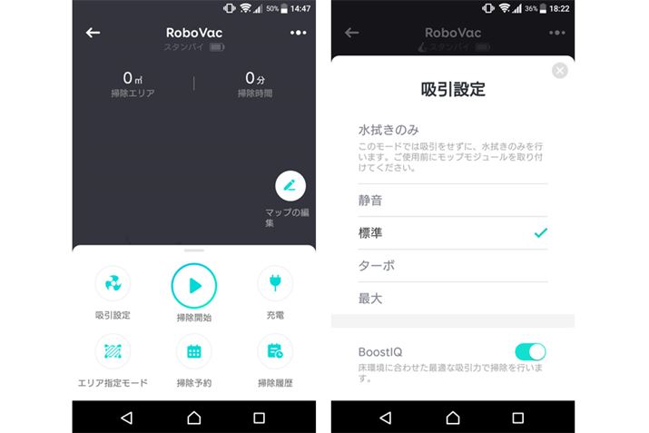 スマートフォンアプリ「Eufy Home」を使って各種操作が行える。「吸引設定」では、稼働時の吸引の強さを静音/標準/ターボ/最大の4段階で設定でき、カーペット上などで自動的に吸引力を引き上げる「Boost IQモード」も用意されている