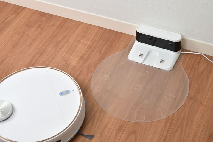 バッテリー残量が少なくなると、自動で充電ステーションに戻り、充電後は中断した場所から掃除を再開してくれる。充電時に床が濡れないよう、充電ステーションは透明の「防水パッド」を取り付けて使用する。約240〜300分でフル充電が可能だ