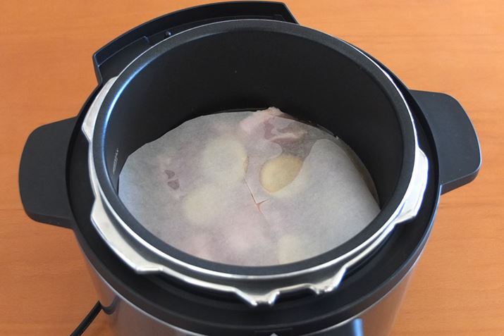 落としぶた代わりのクッキングペーパーを乗せます。「角煮コース」は圧力調理モードでの調理を行いますが、圧力調理の場合、通常の煮込み調理より鍋に入れる水の量が少ないので、具材に味をしっかり染み込ませるためにクッキングペーパーの落としぶたをするのが効果的です