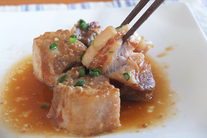 以前、ガス式(直火式)の圧力鍋を試用した時にも作った料理ですが、その際は「角煮」をやわらかく仕上げるために、豚バラ肉の脂を落とし、肉質をやわらかくするための“下茹で”調理と、調味料を加えて味を染み込ませる圧力調理の、2度の「圧力調理」を行いました。実際その仕上がりは文句なしだったのですが、2度の圧力調理はやはりめんどうではありました。