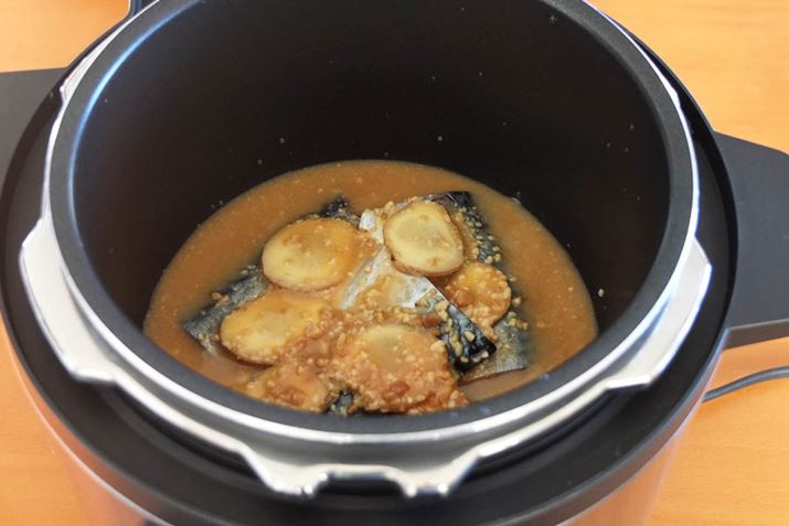というわけで、味や食感が若干不安だったのですが、結果的には味の染み具合は問題なく、さば自体も鍋でじっくりことこと煮たのと同じく、ふっくらジューシーに仕上がりました。加熱時間は調理開始から圧力表示ピンが落ちたあと煮詰める時間も含めて30分弱。通常の鍋で煮込むのと比べて特に時短になるわけではありませんが、簡単な調理設定だけでおいしいさばみそ煮ができるのは超お手軽です。