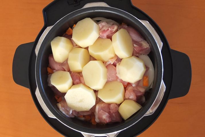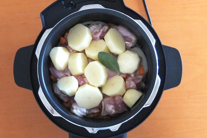 続いて無水調理。となると、最初に作ってみたいのは「無水カレー」です。多めのトマトとたまねぎなどの野菜をみじん切りにし、密閉状態で炒めることで野菜の中の水分を引き出し、その水分で肉など他の食材を煮るわけですが、水を使わないだけに野菜の甘み・うまみが濃厚。今回は、付属のレシピ集に載っているカレーでなく、あえて「じゃがいも、たまねぎ、にんじん、鶏肉」と超王道な食材のみを使った無水カレーのレシピをネットで見つけ、それに従って調理してみました。